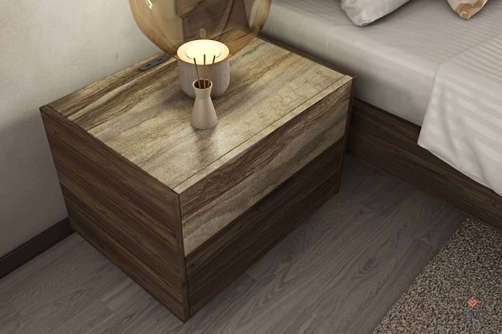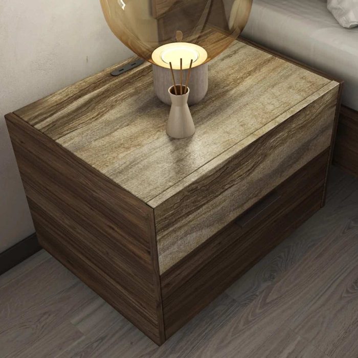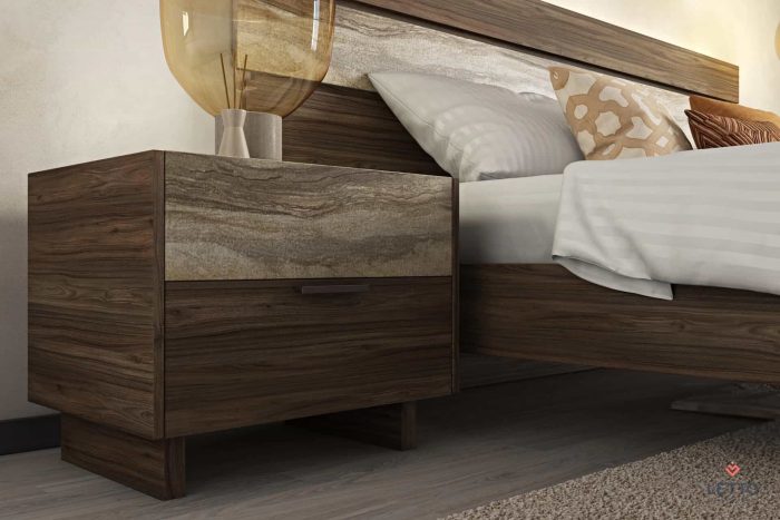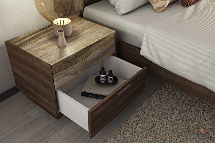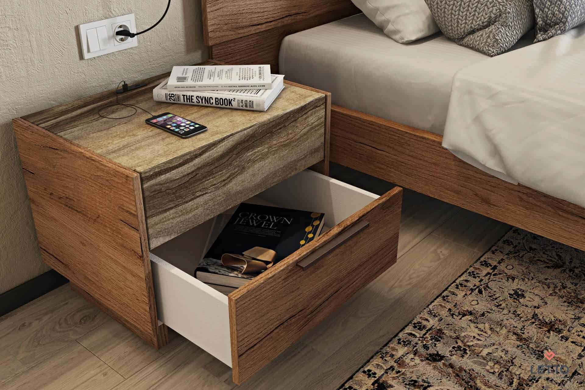 Το κομοδίνο διαθέτει δύο συρτάρια αποθήκευσης, το εσωτερικών των οποίων είναι κατασκευασμένο από ανάγλυφη μελαμίνη σε χρώμα linen beige, ενώ οι μηχανισμοί είναι ρόδας Teflon ιταλικής προέλευσης.
