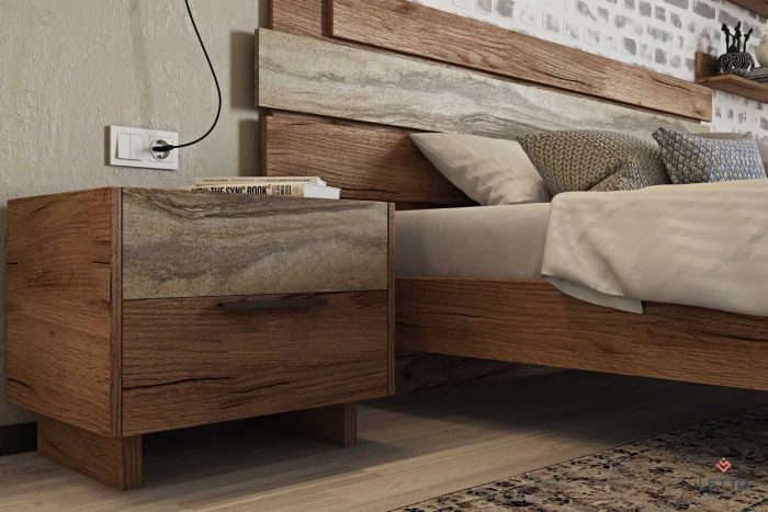 Το κομοδίνο Sicilia είναι κατασκευασμένο από τεχνητό καπλαμά χρώματος light brown rustic oak (m.22) και διαθέτει ιδιαίτερη ανάγλυφη διακοσμητική επιφάνεια στην επάνω αλλά και την μπροστινή του πλευρά. Όλα τα υλικά που χρησιμοποιούνται για την κατασκευή είναι υψηλών προδιαγραφών και διαθέτουν anti-scratch coating για μεγάλη αντοχή στις γρατζουνιές και ευκολία στο καθάρισμα και των πιο δύσκολων λεκέδων. Είναι διαθέσιμο στις διαστάσεις 50/60x43x48Hcm.