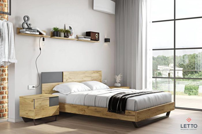 Το κρεβάτι City είναι κατασκευασμένο από τεχνητό καπλαμά χρώματος natural rustic oak (m.18) και συνδυάζεται άψογα με την τεχνητή επιφάνεια λάκας χρώματος truffle brown (m.27.1), η οποία βρίσκεται στην αριστερή γωνία του κρεβατιού. Είναι διαθέσιμο στις διαστάσεις 150/160/180x200cm. Διαθέτει μεταλλική βάση στήριξης χρώματος truffle brown, η οποία και ολοκληρώνει το στυλ του κρεβατιού.