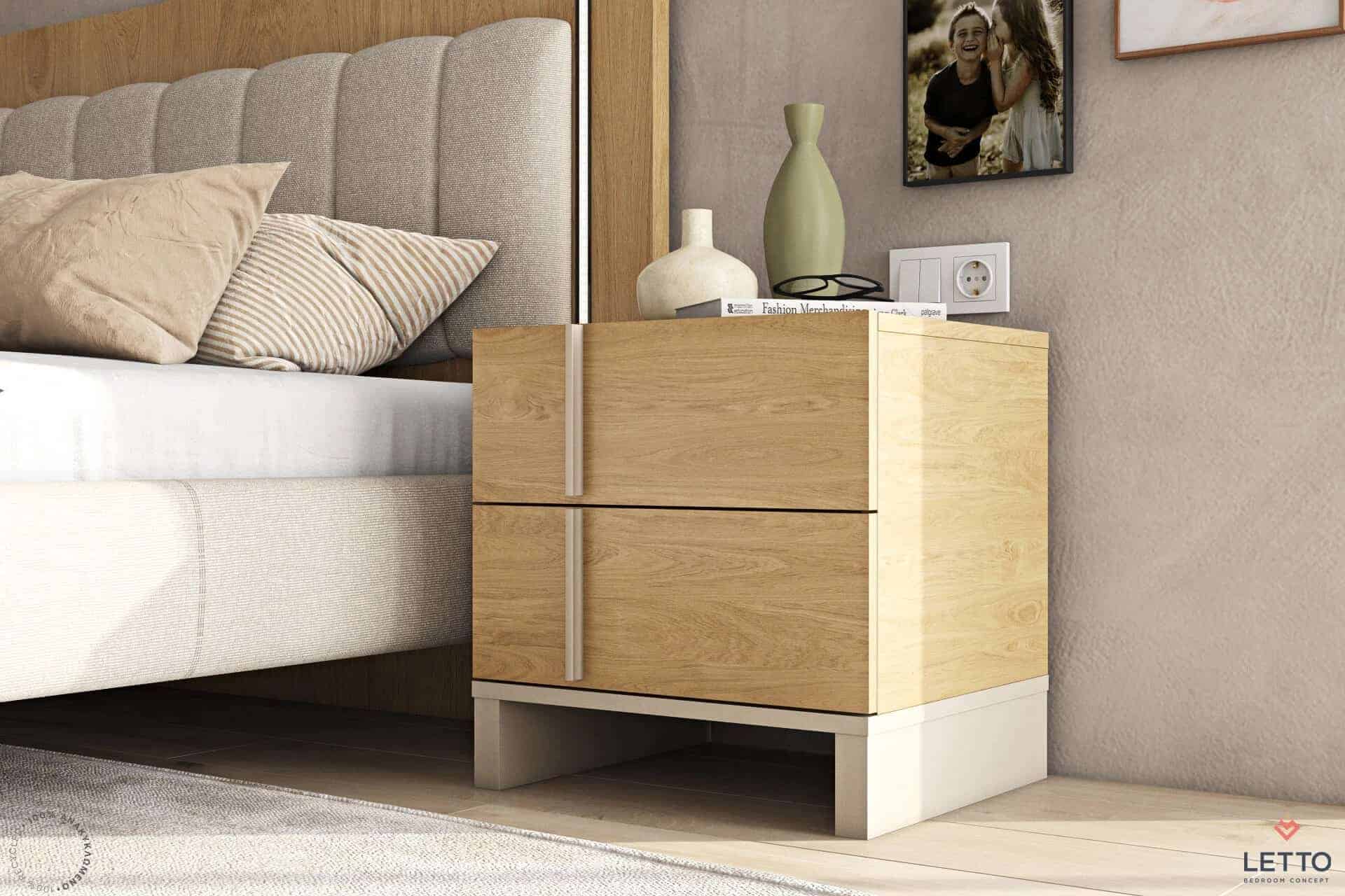 Το κομοδίνο της Mod Collection σχεδιάστηκε με βασικό χαρακτηριστικό την ξύλινη βάση στήριξης σε χρώμα Cream beige Μ11.1 που ταιριάζει απόλυτα με τα ξύλινα λακαριστά κάθετα τοποθετημένα πόμολα επάνω στην ανάγλυφη μελαμίνη με τα χαρακτηριστικά νερά του δρυς στο κλασικό χρώμα Μ.31 Light Oak!