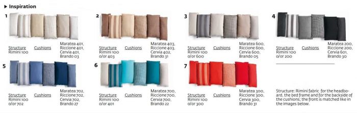 Για το κρεβάτι Birdland μπορεί να επιλεγεί ένας από το 7 συνδυασμούς που φαίνονται παρακάτω. Το ύφασμα Rimini χρησιμοποιείτε για το κεφαλάρι, το πλαίσιο κρεβατιού και την πίσω πλευρά των μαξιλαριών. Η μπροστινή πλευρά των μαξιλαριών έχει το αποτέλεσμα των παρακάτω φωτογραφιών. Τα υφάσματα που χρησιμοποιούνται είναι από την κατηγορία υφασμάτων Β και τιμολογιακά ο συνδυασμός inspiration ανήκει στην κατηγορία υφασμάτων Α.