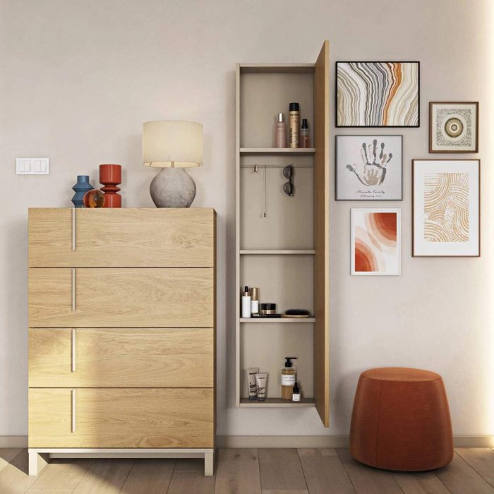 Το ντουλαπάκι με καθρέφτη της Mod Collection σχεδιάστηκε με βασικό χαρακτηριστικό το μεγάλο ξύλινο πόμολο στο πλάι και κατασκευάζεται από 100% ανακυκλωμένη ανάγλυφη Light Oak Μ.31 αντίστοιχα.