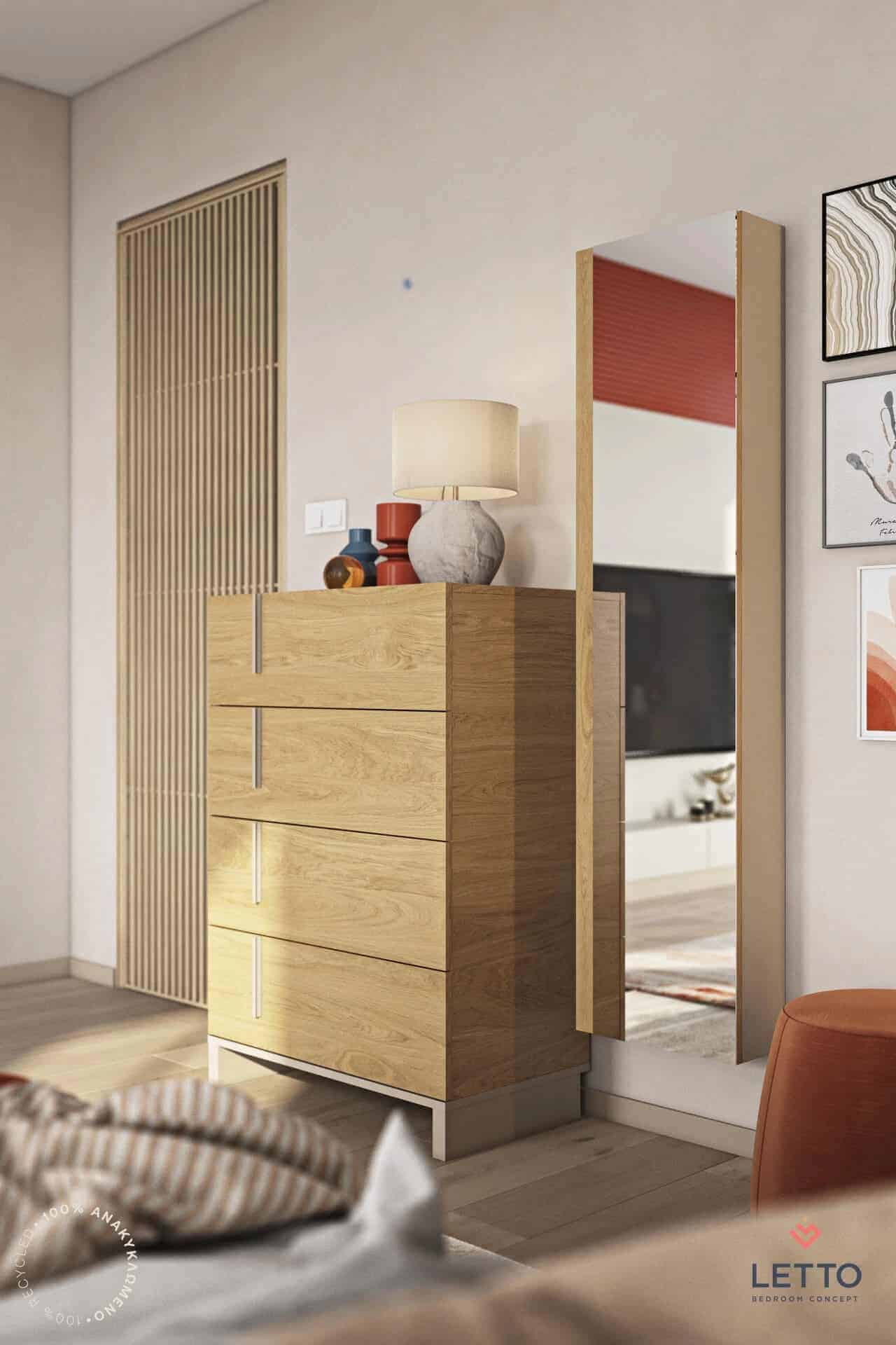 Για το υπνοδωμάτιο διαλέξτε το ξύλινο κρεβάτι Mod, για εύκολο καθάρισμα, τα κομοδίνα των 40εκ, για εξοικονόμηση χώρου, τη χρήσιμη συρταριέρα με τα 4 συρτάρια τοποθετημένη δίπλα στο επιδαπέδιο ντουλαπάκι με καθρέπτη Mod, ενώ στον απέναντι τοίχο μπορείτε να τοποθετήστε τη μπαγκαζιέρα.