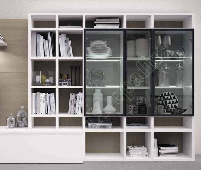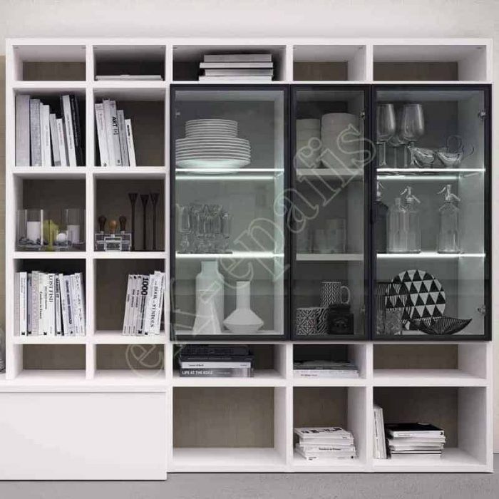 - Σύνθεση βιβλιοθήκης, ντουλάπα με τρεις πόρτες, έπιπλο βάσης τηλεόρασης με δύο ντουλάπια (500×33.3×163.3cm ύψος)